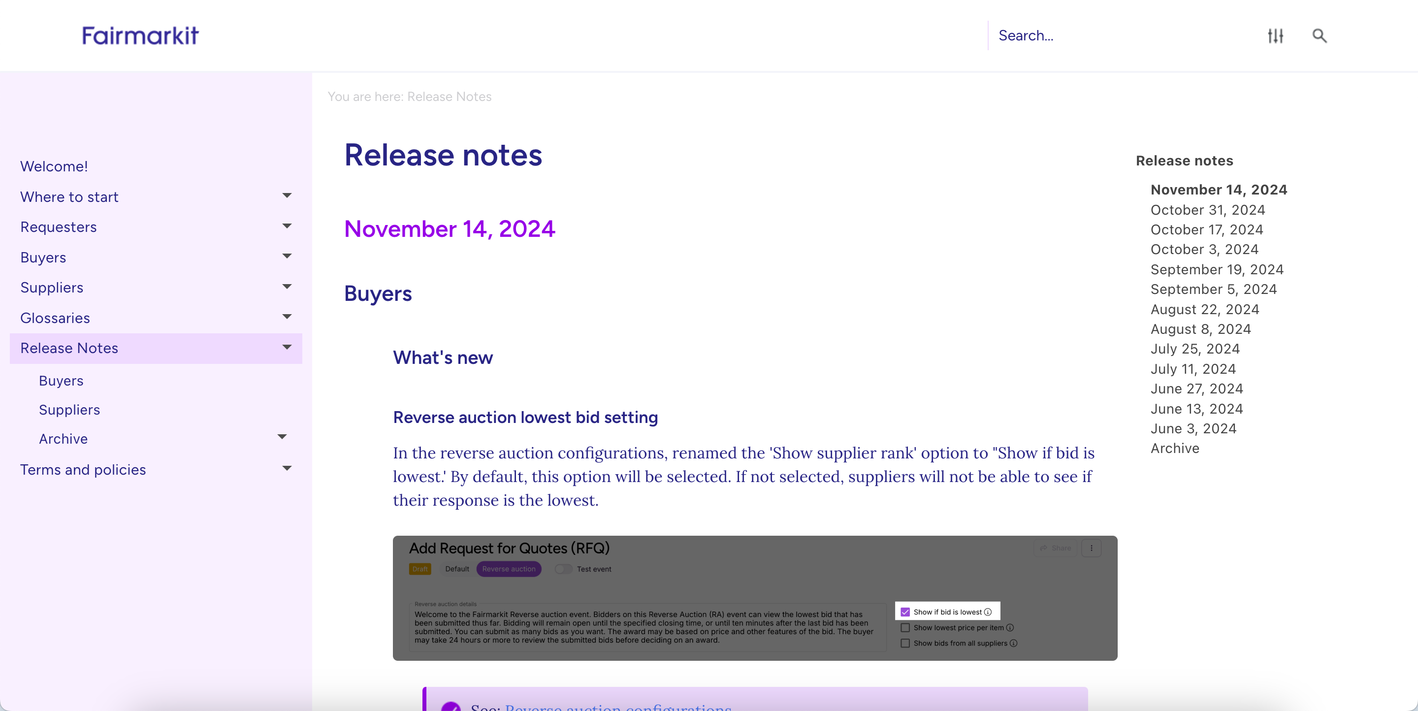 On release day, [release notes](https://docs.fairmarkit.com/release-notes/release-notes) are published to the documentation ([docs.fairmarkit.com](http://docs.fairmarkit.com/)), highlighting all changes in a release. Additionally, documentation is also available for more information about the features.