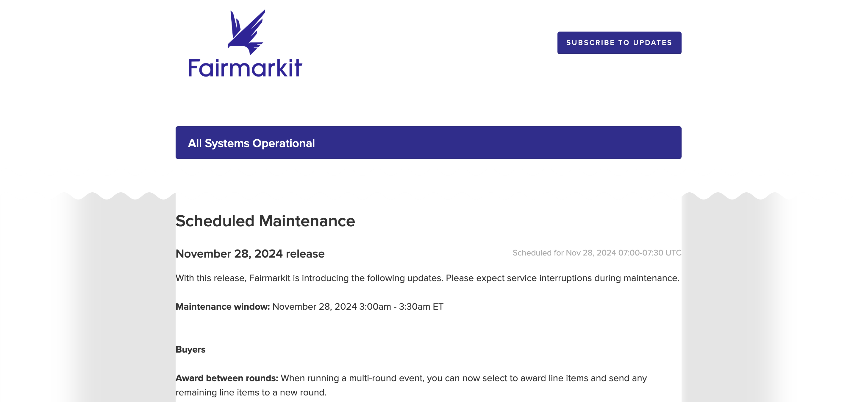 On the Fairmarkit Statuspage (<https://fairmarkit.statuspage.io/>), we post a high-level overview of the upcoming release one week before it is released. This provides you with insight into the release and gives you time to reach out and ask questions.