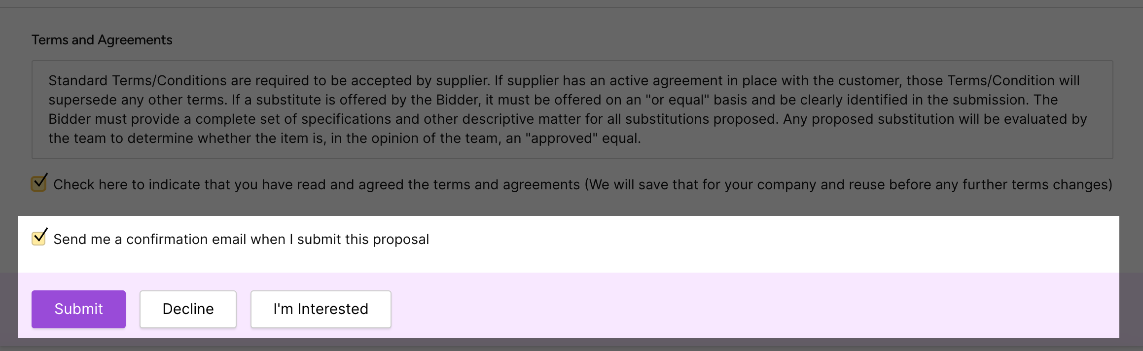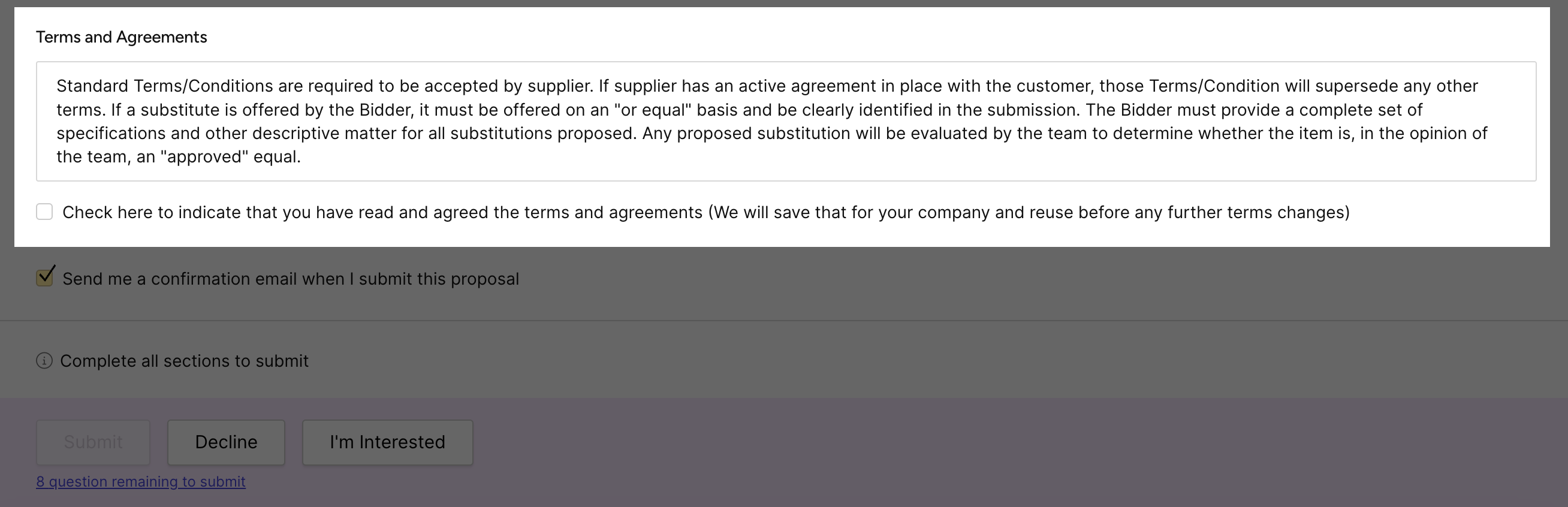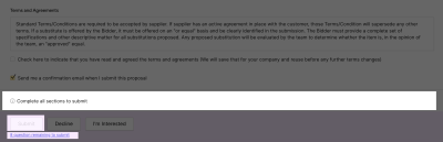 |       | Send me a confirmation email when I submit this proposal                                               | Select if you want to receive an email confirmation when you submit your response to the buyer.                                                                                                                                                                                                                                                                                                                                                                                                                                                   |