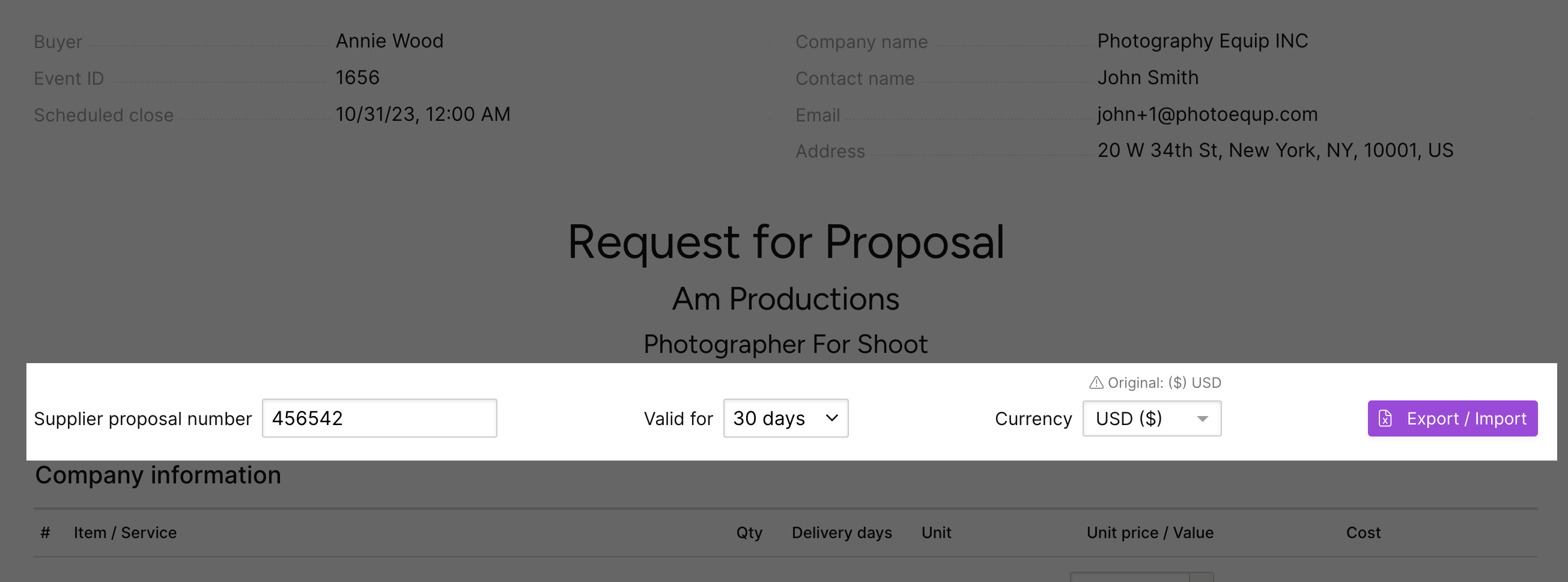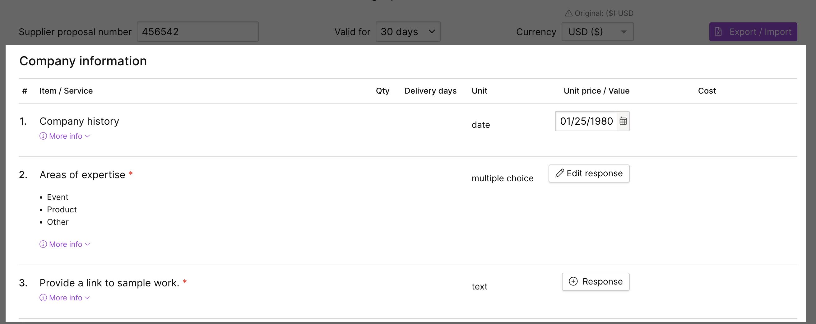 |       | Currency                                                                                                                                                              | Select the currency you want to submit your response in. The prices will remain in your currency, but when the buyer reviews your response, it will be converted to their selected currency. |
