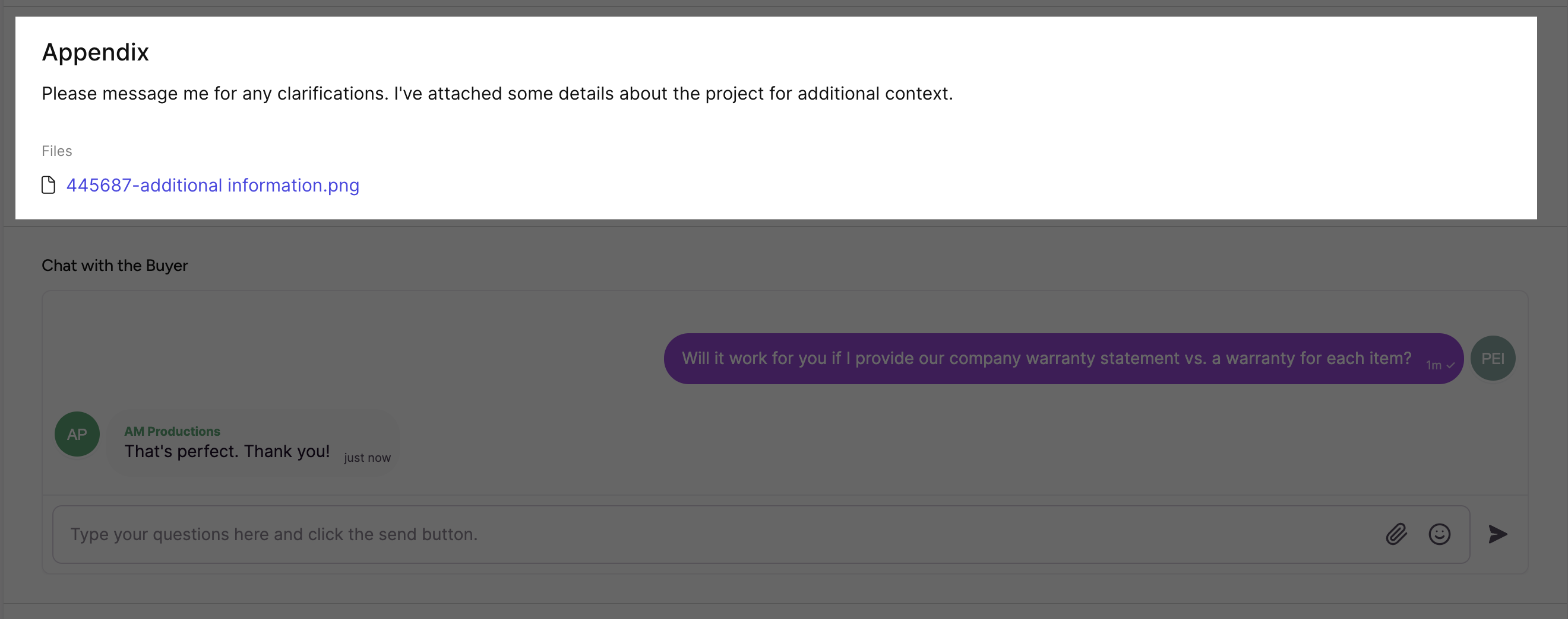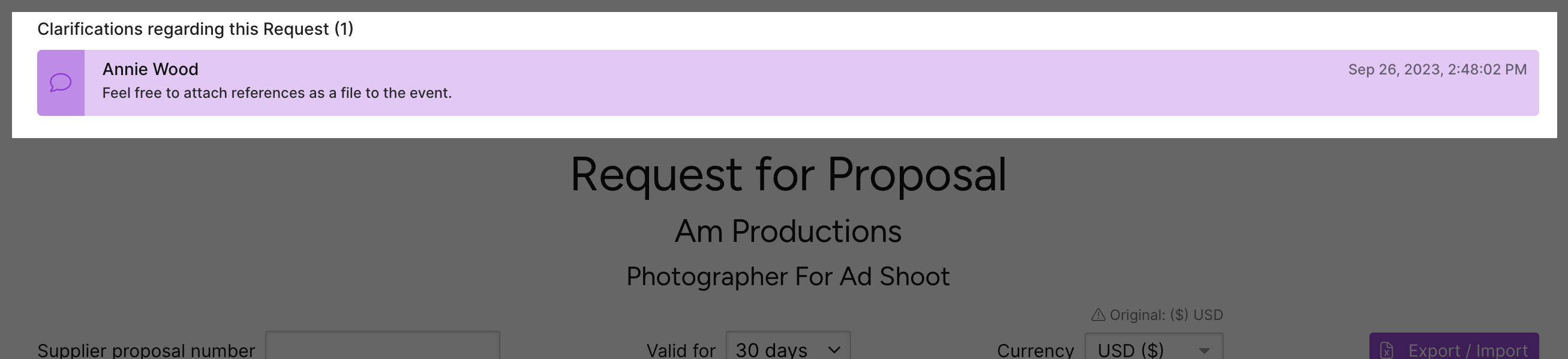 After a buyer has submitted an event, they can send a clarification. Clarifications can include text and attachments and are date and time-stamped. All clarifications display in the **Clarifications regarding this request area.**