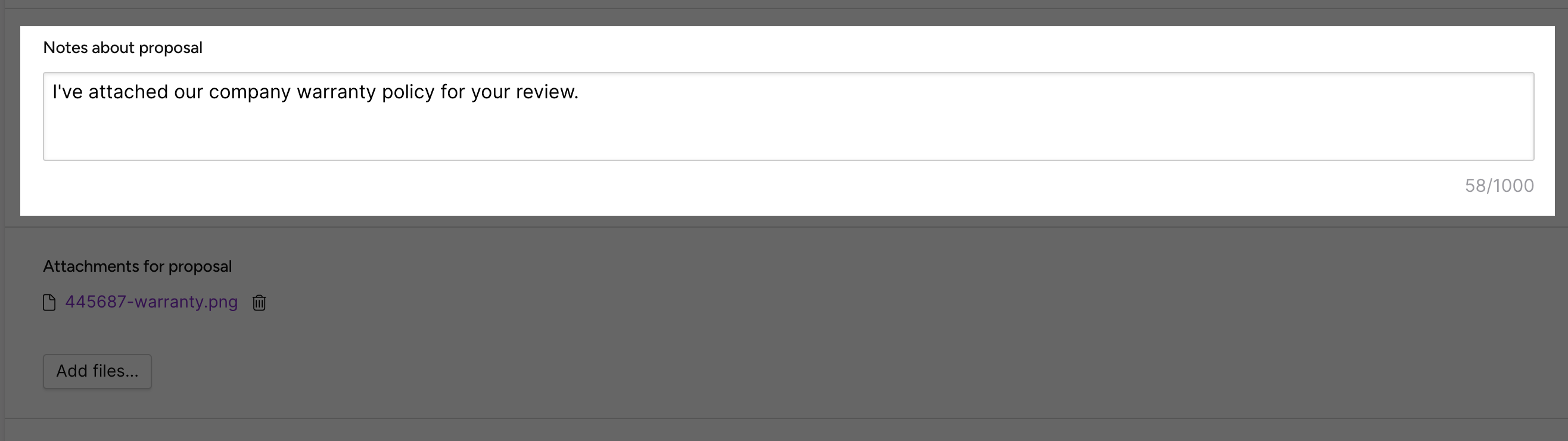 Click Add Files to attach files to share with the buyer. Files can be up to 100MB, and the File name cannot be longer than 255 characters. See [Attachments](https://docs.fairmarkit.com/suppliers/suppliers/events/respond-to-an-event/attachments) for more information.
