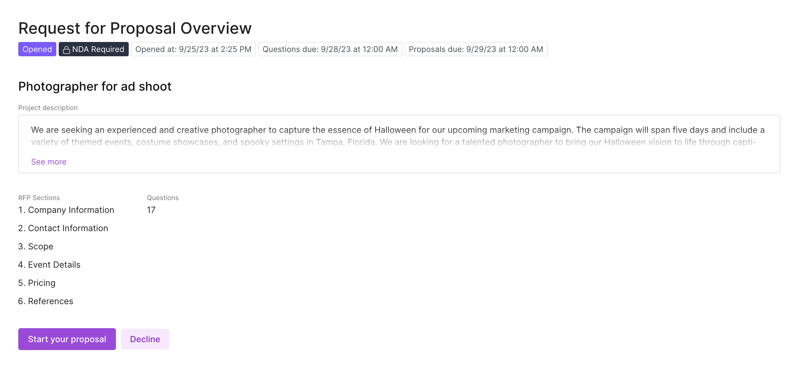 Before you agree to respond to an event, you can view an event overview. This includes a summary of the due dates, an outline of the event sections, the number of questions, and the project description. After reviewing, you can choose to **Start your proposal** or **Decline** the event.